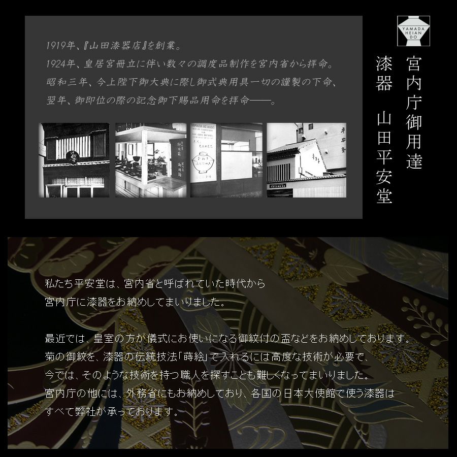「漆は三代にわたり使うもの」という言葉がございます。日々の暮らしに寄り添い、長く使える漆器。使い込むことで艶が出て、豊かな表情になる漆器。「宮内庁御用達」を拝命した当時から変わらぬ思いを胸に、伝統的な意匠の品から、モダンなデザインの品まで幅広くご用意しております。