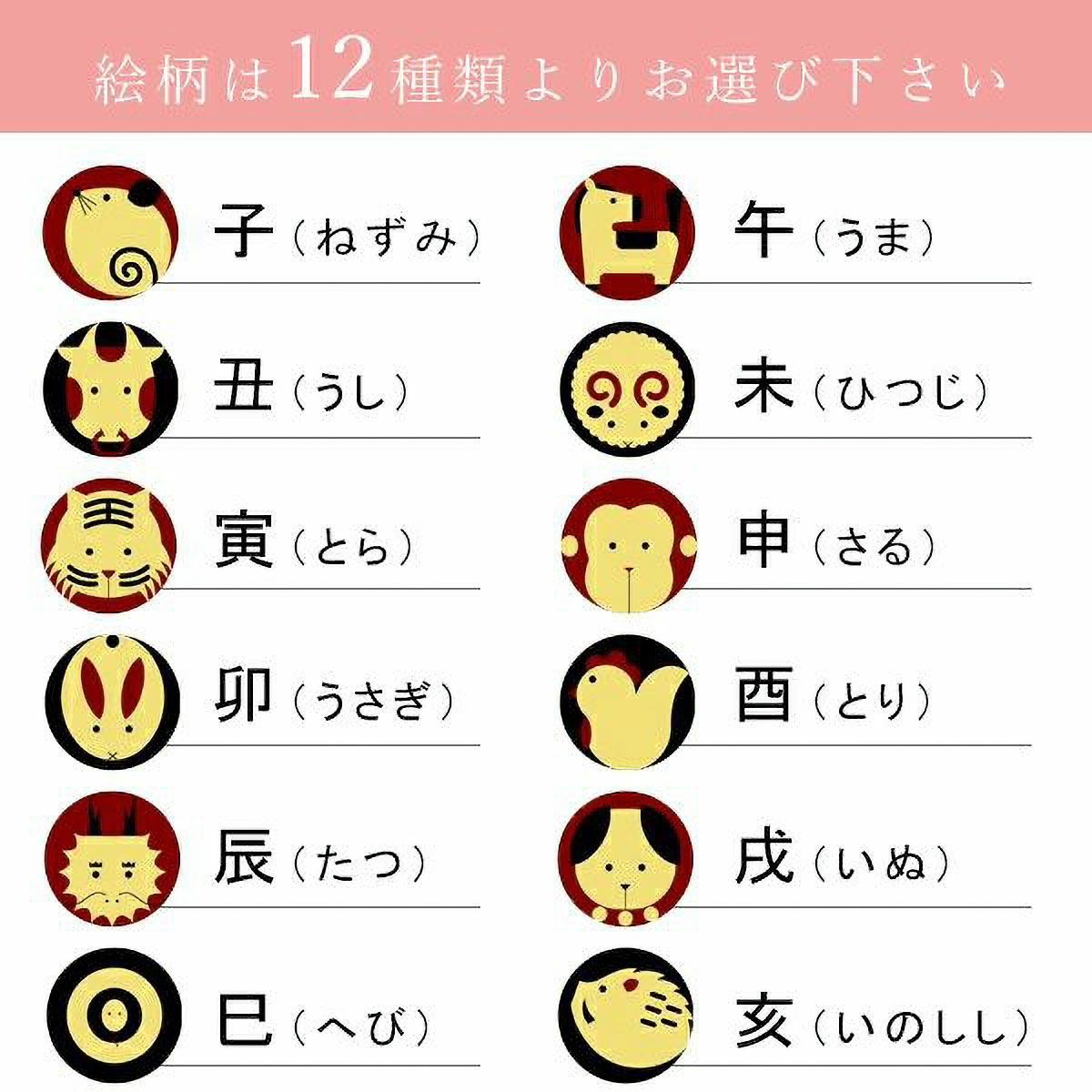 十二支から、ご自身の生まれ年の動物をお選びいただくことができます。