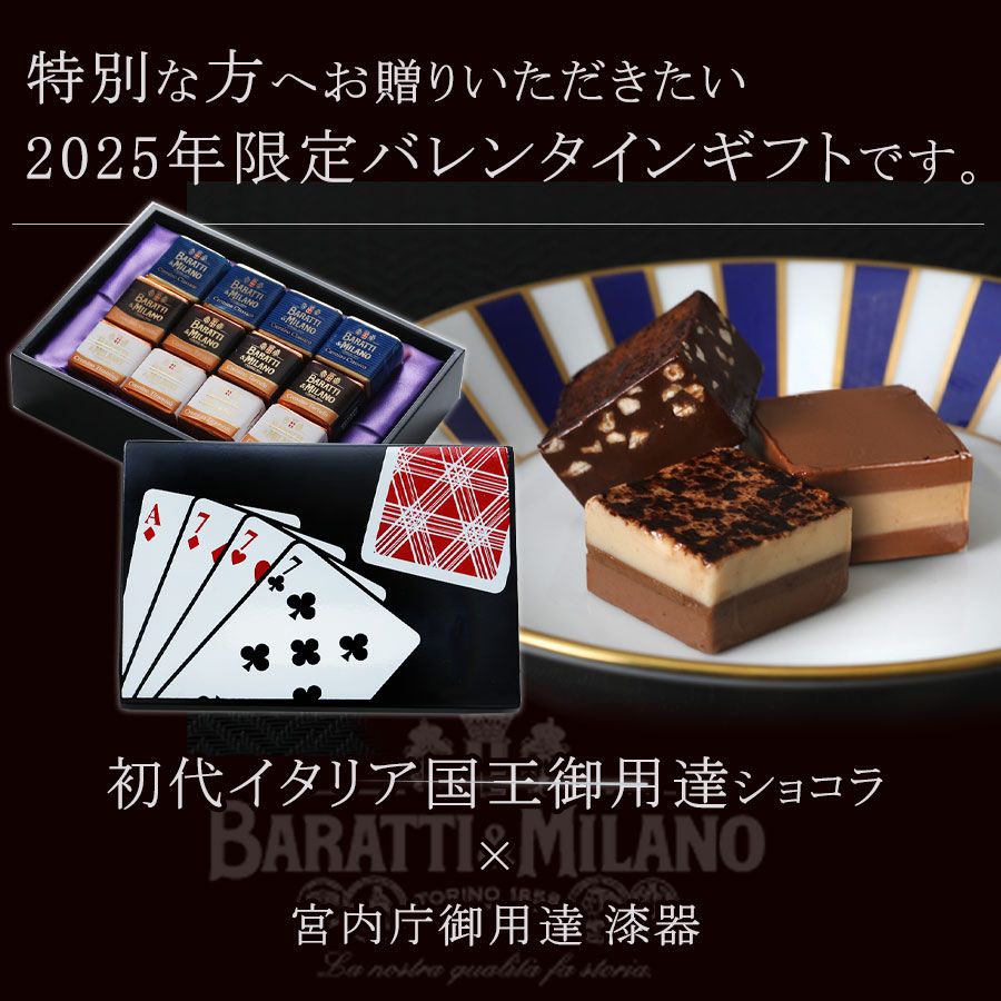 初代イタリア王室御用達「BARATTI&MILANO」の高級ショコラを、漆器山田平安堂の小箱に詰めてお届けするバレンタイン限定のギフト。